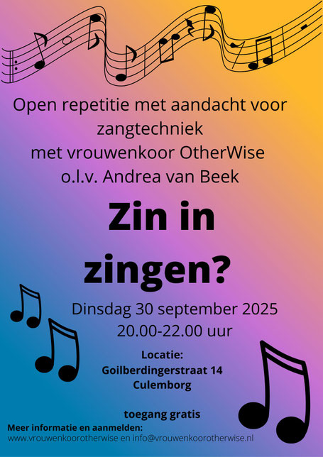 Op dinsdag 30 september van 20.00-22.00uur is er een open repetitie met vrouwenkoor OtherWise.